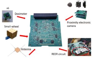 - and finally, the Payload and Platform management board, CU and PF board , which manages the dosimeters and ensures various connections.