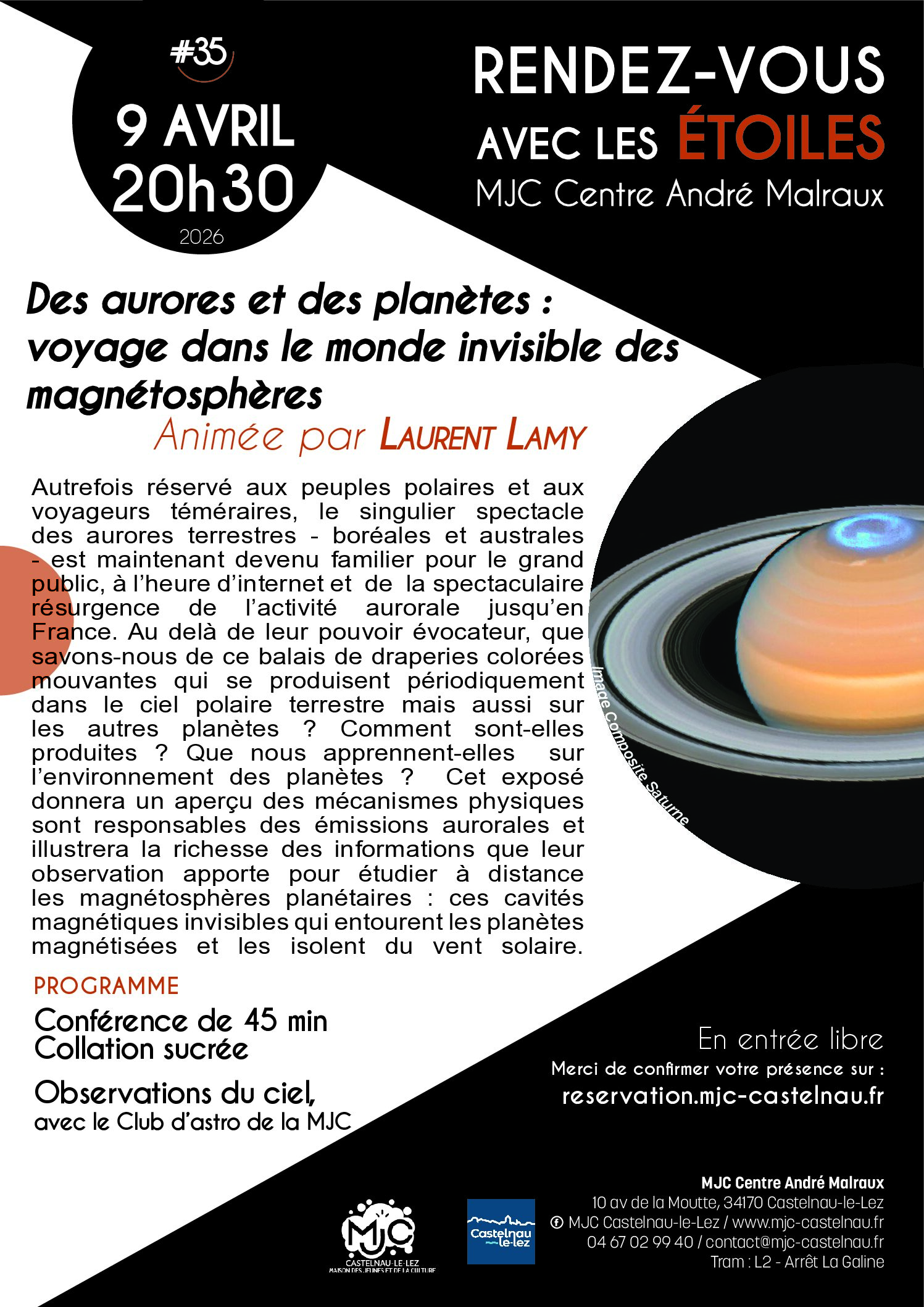Jeudi 9 Avril, à 20h30, Laurent Lamy animera « Des aurores et des planètes : voyage dans le monde invisible des magnétosphères » / Entrée libre.