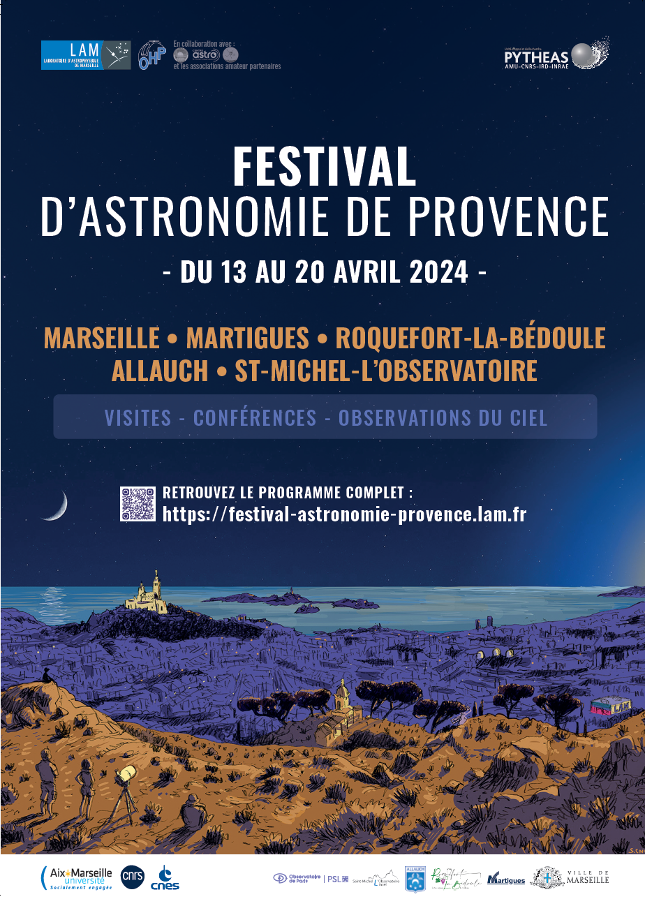 La deuxième édition du Festival d’Astronomie de Provence, organisé par le LAM, a lieu du 13 au 20 avril 2024: observations, conférences, visites. Retrouvez le programme sur le site dédié au festival : https://festival-astronomie-provence.lam.fr/