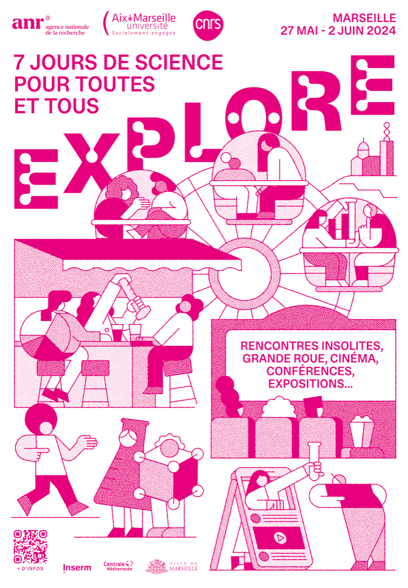A propos du festival EXPLORE: Du 27 mai au 2 juin 2024, le festival EXPLORE s’installe à Marseille pour sa première édition. Co-organisé par Aix-Marseille Université et le CNRS en partenariat avec Centrale Méditerranée et l’Inserm, c’est un nouveau rendez-vous festif, gratuit et ouvert à toutes et tous, petits et grands. Plus de 80 scientifiques viennent à la rencontre des Marseillaises et Marseillais à travers des activités ludiques et interactives. L’occasion de plonger au cœur de la recherche et d’explorer son impact sur notre quotidien ! Au programme : tête-à-tête insolites, immersion virtuelle, visites de laboratoires et bien plus encore.