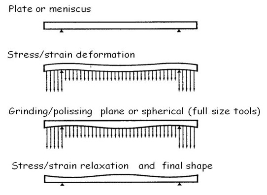 Nos fabrications optiques mettent en oeuvre la technique de polissage sous contrainte. Cette technique est étudiée et développée au LAM depuis les années 1960. Par cette approche, qui consiste à déformer élastiquement la pièce en cours de polissage afin de lui donner la forme asphérique opposée de celle désirée, il est possible de fabriquer des optiques très asphérisées (paraboles hors-axe, hyperboles, miroirs toriques, freeform…) en conservant les avantages inhérents au polissage sphérique classique (bon rendement, continuité de la surface par polissage pleine pupille). Cela permet d’obtenir une qualité de polissage inégalée: les erreurs de forme atteintes sont de quelques nm RMS sur la zone utile et les rugosités sont typiquement à l’échelle de 1nm RMS, voire moins selon certaines applications. Cette technique de polissage sous contrainte pleine taille garantit la continuité de la surface et ne génère pas de défauts de moyennes fréquences spatiales typiques du polissage robotique industriel tels que anneaux concentriques et autres marques de polissage.