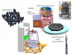 Tirant parti du large champ de vision de Subaru, qui est encore étendu grâce au correcteur à grand champ récemment achevé, PFS nous permettra d’effectuer la spectroscopie multifibre de 2400 cibles dans un diamètre de 1,3 degré. Une microlentille est fixée à l’entrée de chaque fibre pour transformer le rapport F en un rapport plus grand, ce qui permet de surmonter les difficultés de conception du spectrographe. Les fibres sont placées avec précision sur les cibles par des positionneurs, chacun composé de deux étages de moteurs rotatifs piézo-électriques, par itérations en utilisant des mesures de position de fibres rétro-éclairées avec une caméra de métrologie à grand champ. Les fibres transportent ensuite la lumière vers un ensemble de quatre spectrographes de Schmidt rapides identiques, dotés chacun de trois bras de couleur : les gammes de longueurs d’onde de 0,38 um à 1,3 um seront observées simultanément avec un pouvoir de résolution moyen de 3000.