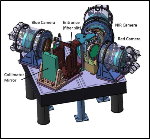 Tous les composants opto-mécaniques du spectrographe sont montés sur un banc optique en fibre de carbone de 2.4×1.9m. Tous les éléments (à l’exception des cryostats) seront équipés de déflecteurs pour empêcher la lumière parasite et la poussière de pénétrer.