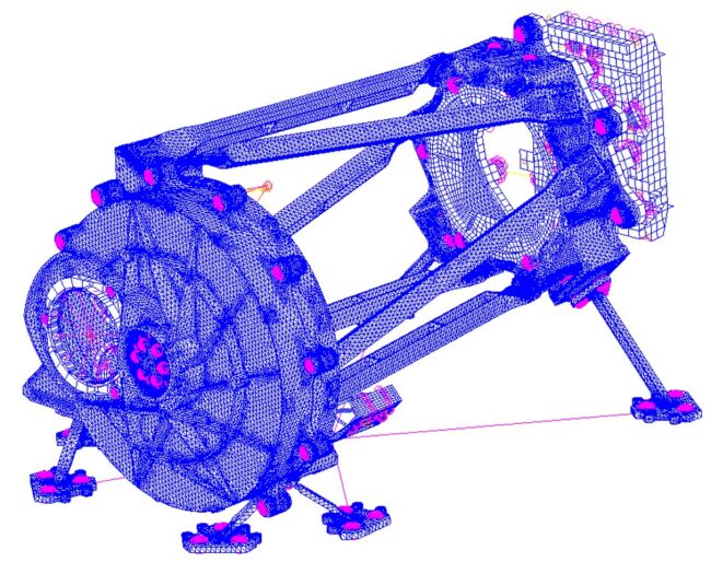 Modèle éléments finis Statiques linéaires et non linéaires, les modes normaux, les valeurs propres, les phénomènes transitoires ou dynamiques, les réactions en fréquence ou les réactions harmoniques, les spectres de réaction, les réactions aléatoires et le flambement, thermique sont réalisées grâce à un Bundle de 50 licences Patran/Nastran.