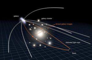 De part sa masse, un amas de galaxies déforme localement l’espace temps, si bien que la trajectoire des rayons lumineux provenant de galaxies d’arrière plan se trouve déviée, un phénomène dit de « Lentilles Gravitationnelles » (gravitational lensing).